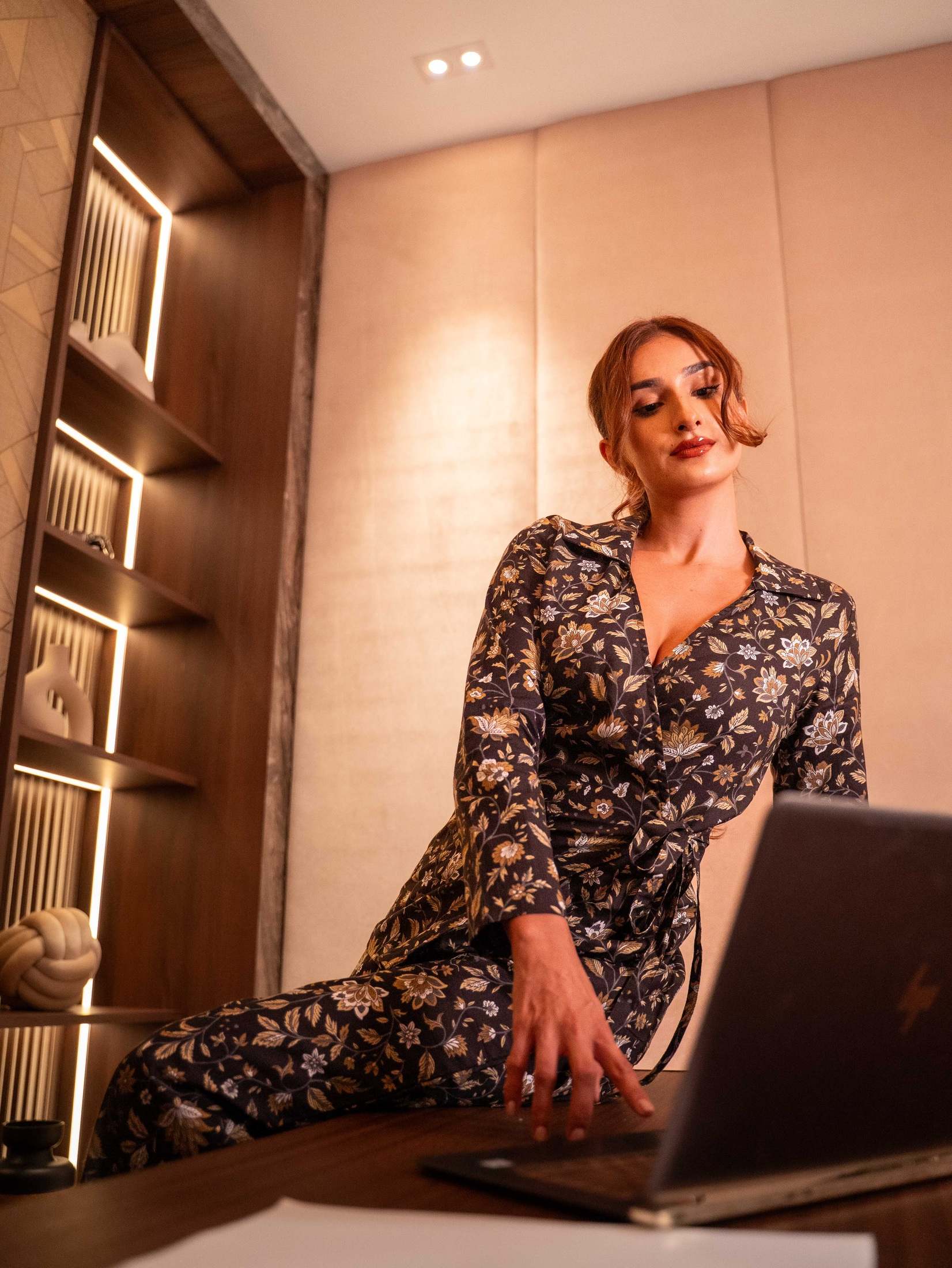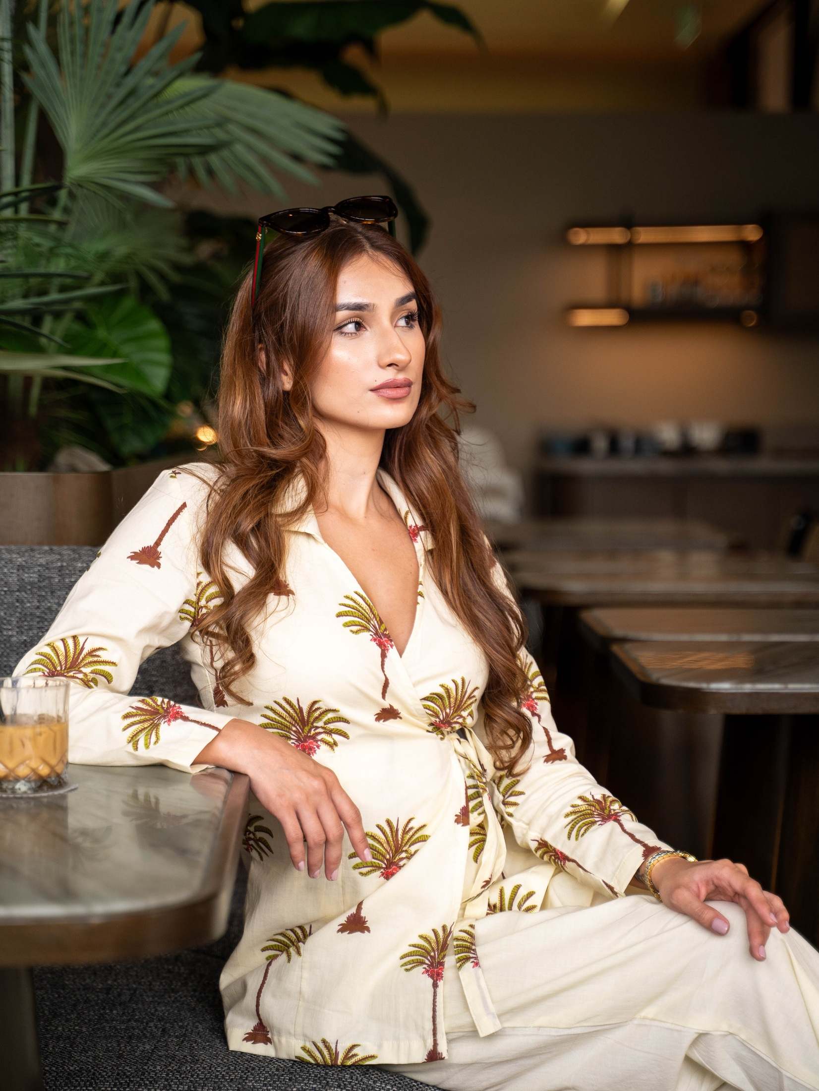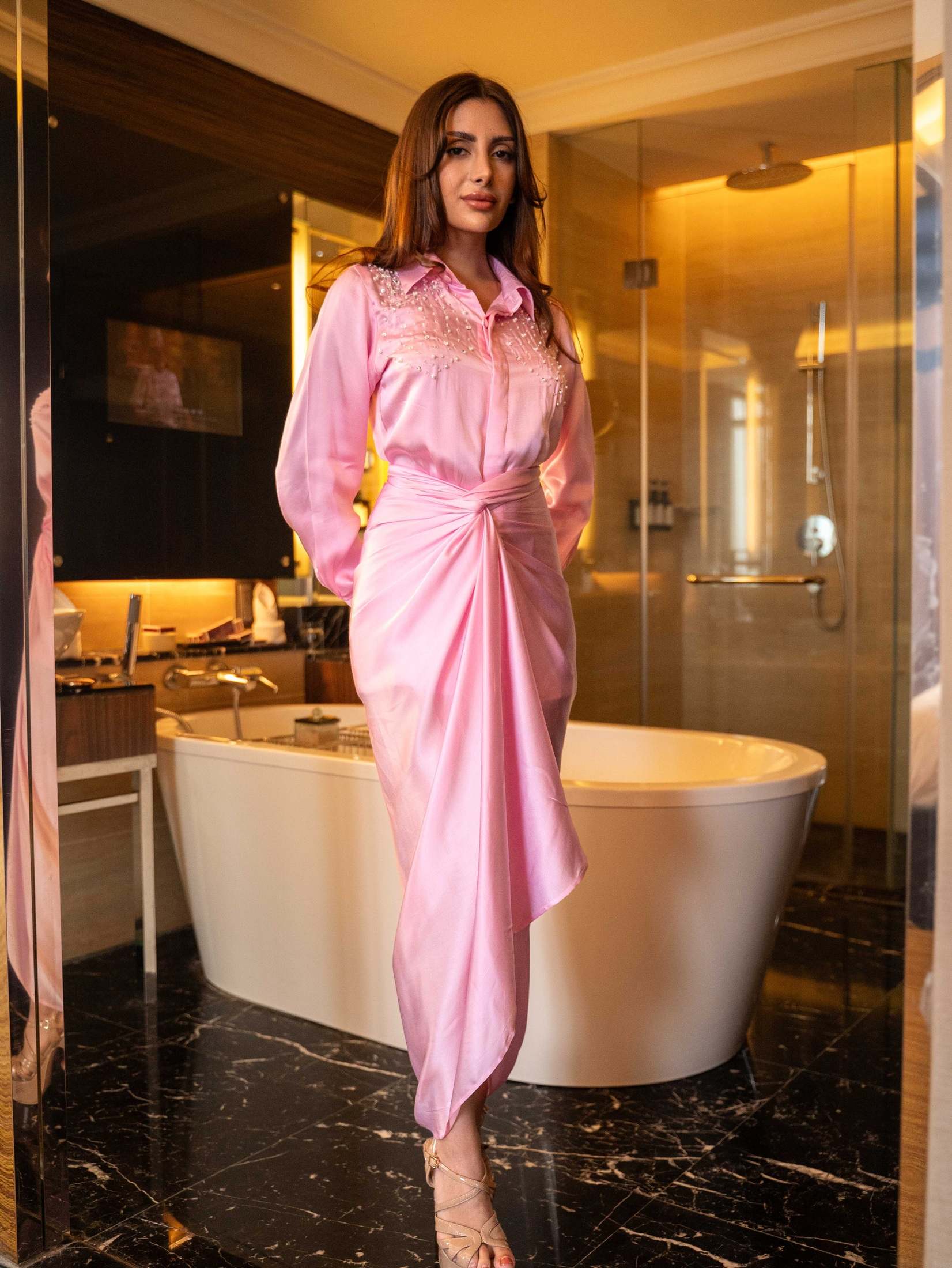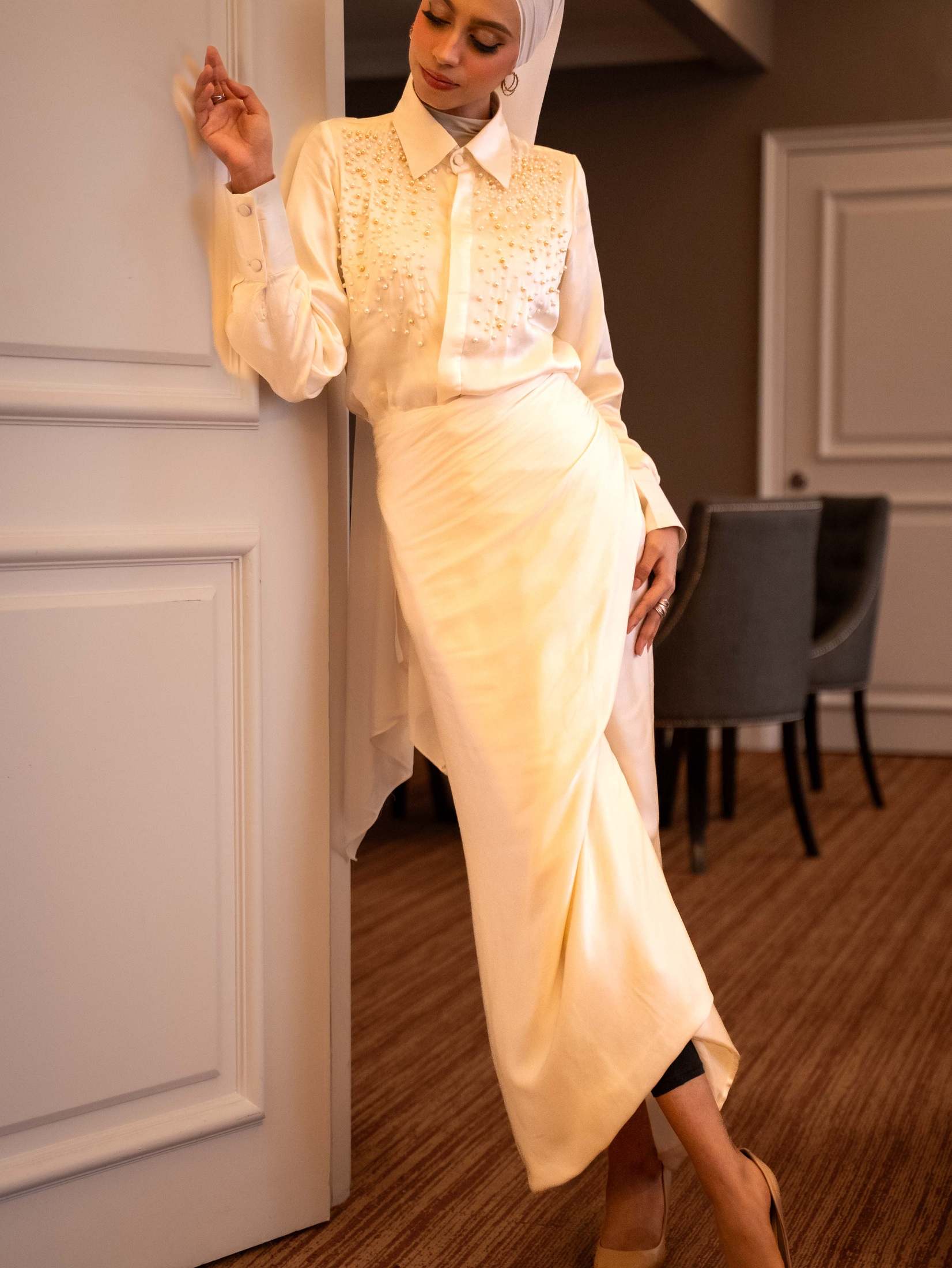 A two-piece shirt and draped sarong crafted in luxurious modal satin.