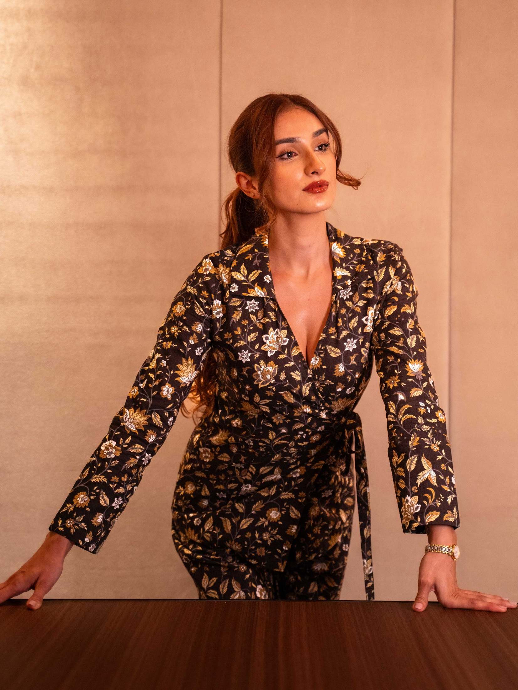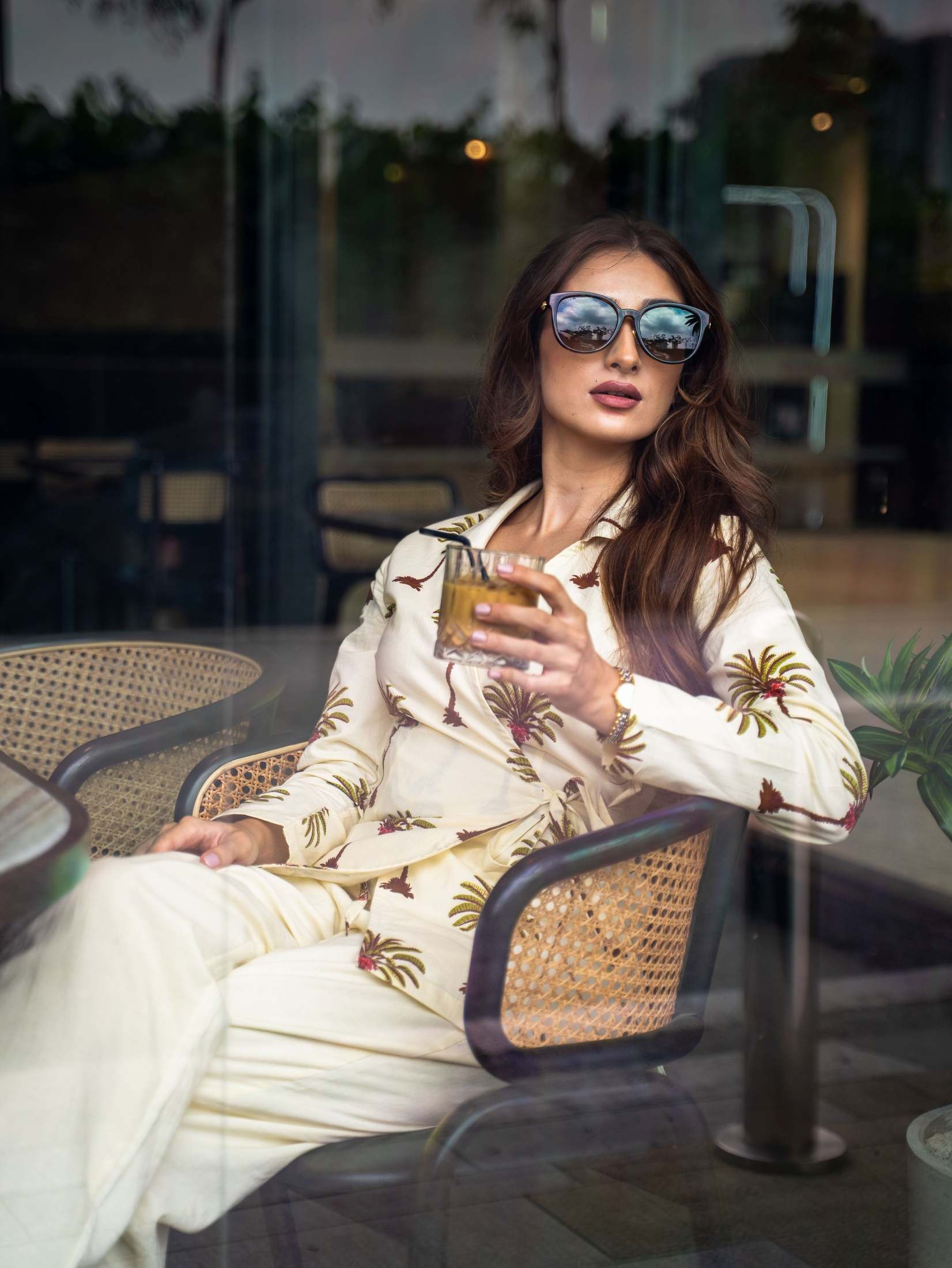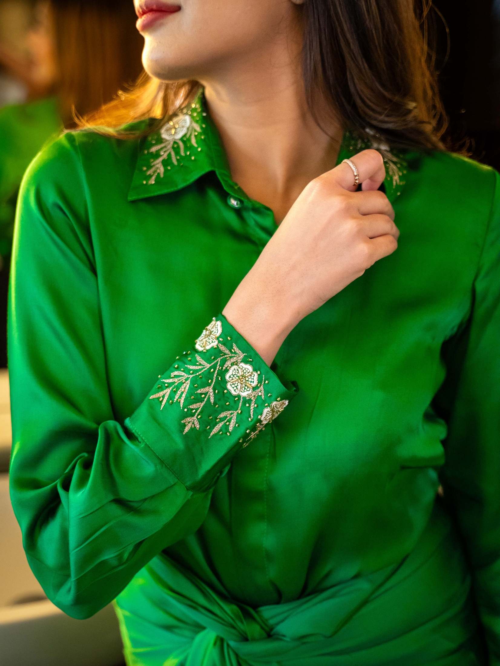 A two-piece shirt and draped sarong crafted in luxurious modal satin.