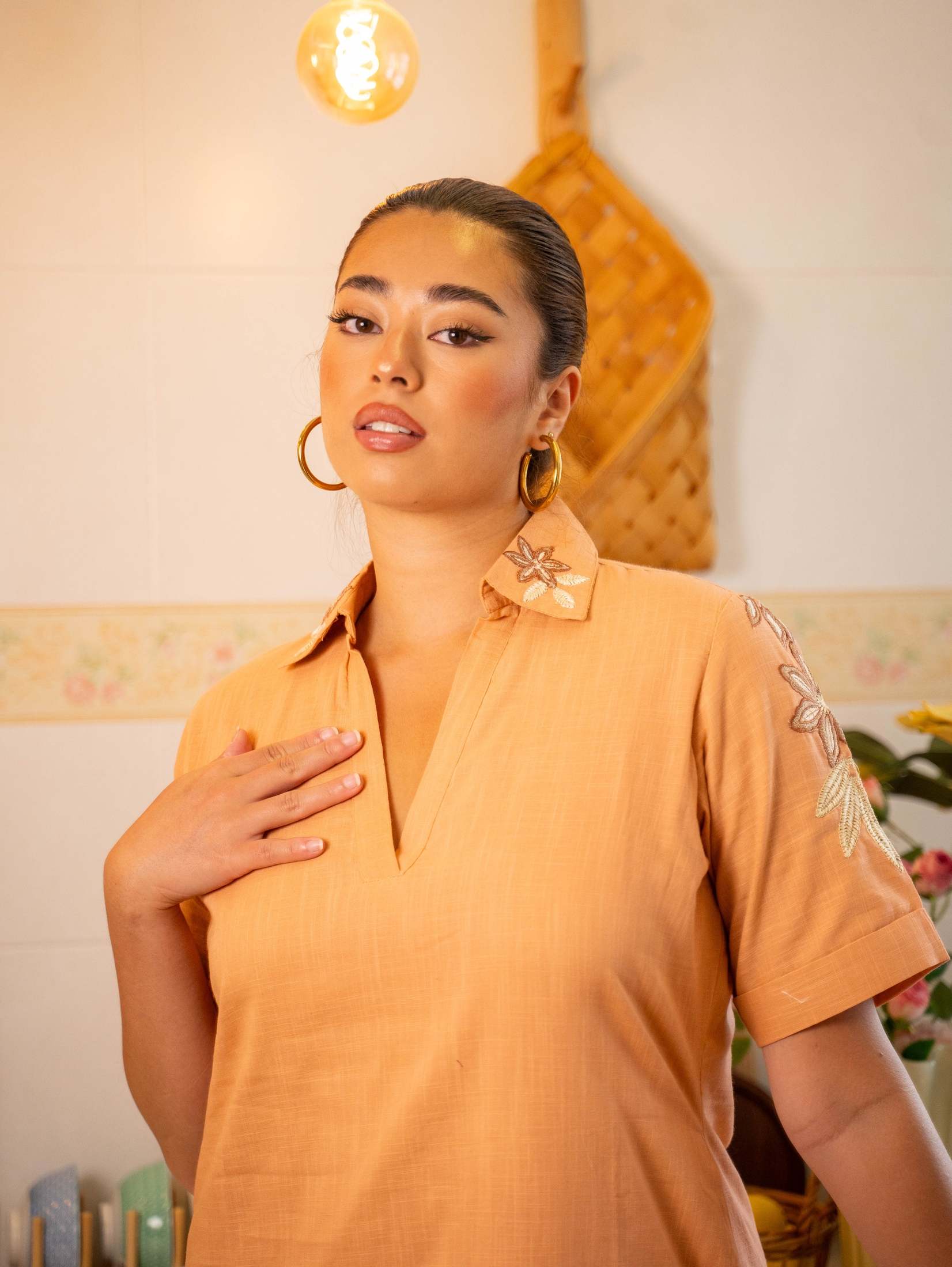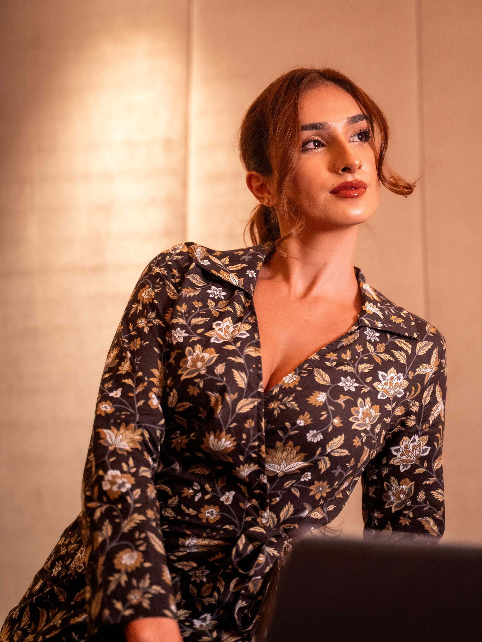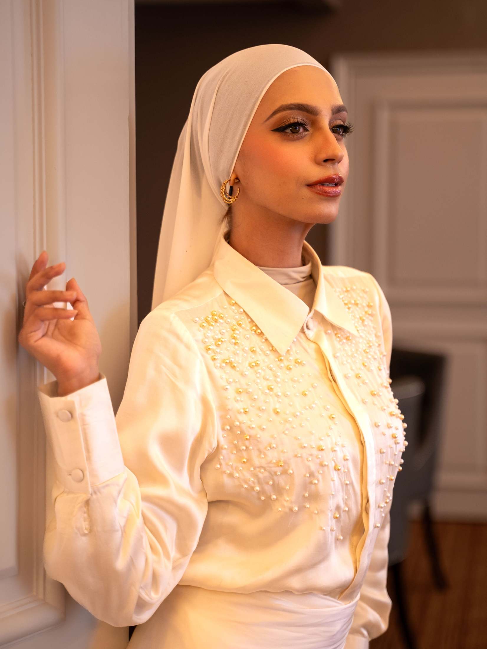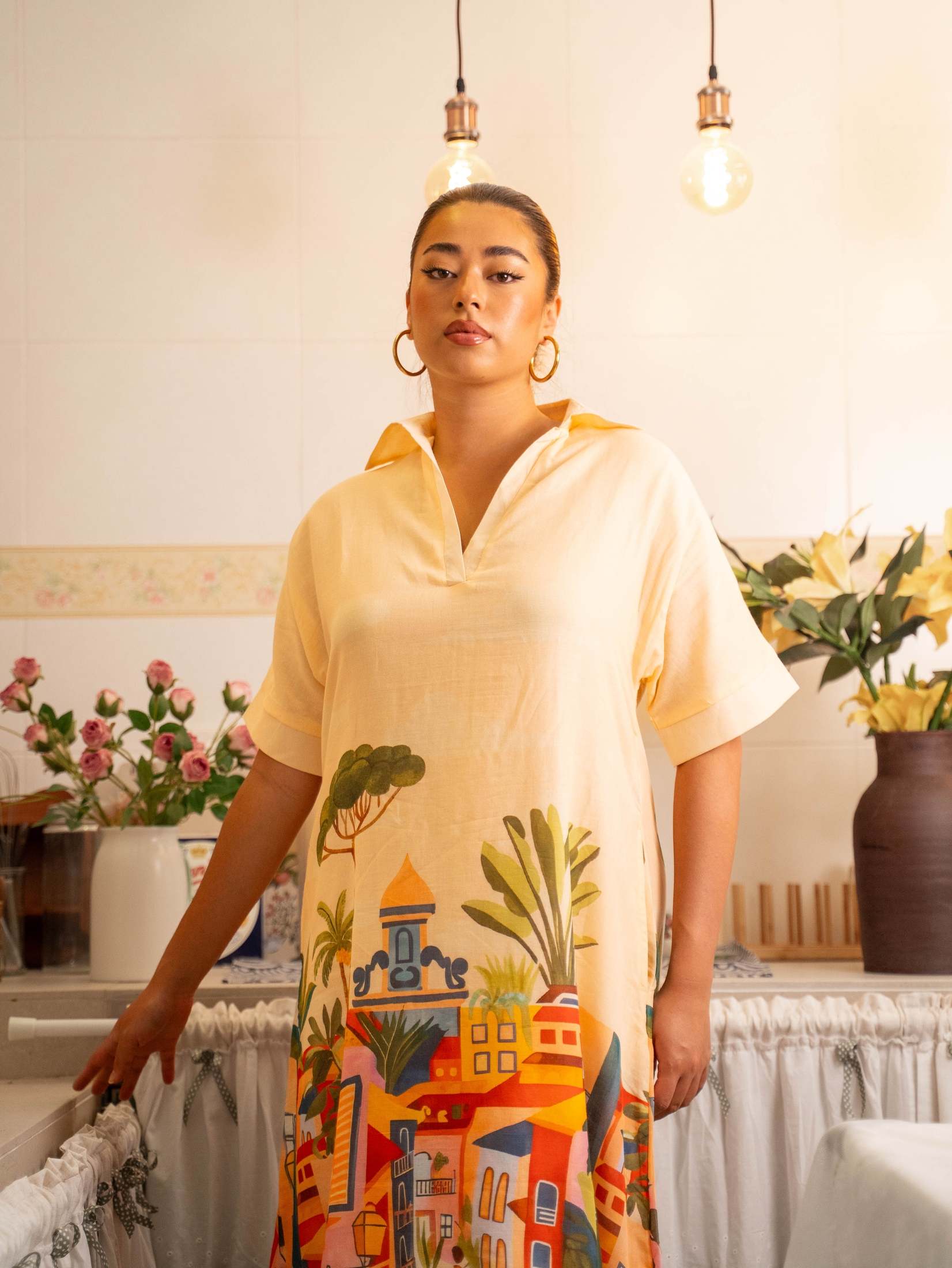 A two-piece shirt and draped sarong crafted in luxurious modal satin.